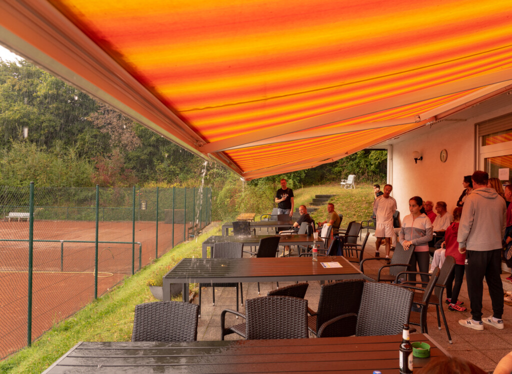 Entgegen des Wetterberichts setzte ab dem frühen Nachmittag heftiger Regen ein. Die Spiele der Herren B Konkurrenz konnten noch beendet werden, bevor auf den Plätzen erst mal gar nichts mehr ging. Dies tat der guten Stimmung aber keinen Abbruch, zumal das reichhaltige Grillbuffet keine kulinarischen Wünsche offenließ.